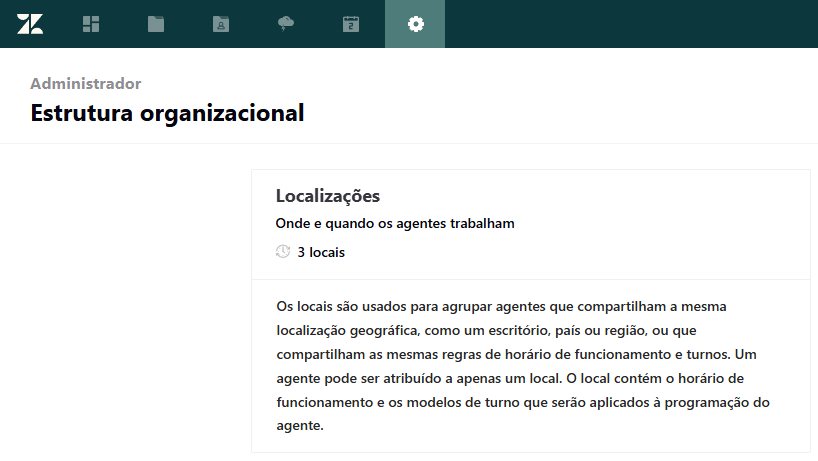 Os locais fazem parte de sua estrutura organizacional e são usados para agrupar agentes que compartilham a mesma localização geográfica. Você também pode usar locais para dividir equipes na mesma localização física com diferentes turnos e regras de programação. Por exemplo, você pode criar dois locais em São Francisco: um para agentes de meio período e um para agentes de período integral.