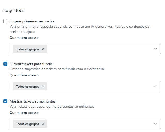O recurso de tickets semelhantes ajuda você encontrar os tickets relacionados àqueles nos quais está trabalhando, usando a IA para dar um gás na sua eficiência. Esse recurso considera fatores como intenção, correspondência de entidades e antiguidade para garantir a relevância. Administradores podem ativar ou desativar esse recurso e controlar o acesso ao grupo. Esse recurso exclui chat em tempo real, mensagens nativas, conversas por redes sociais e canais de voz, e funciona melhor com mais de 50 tickets.