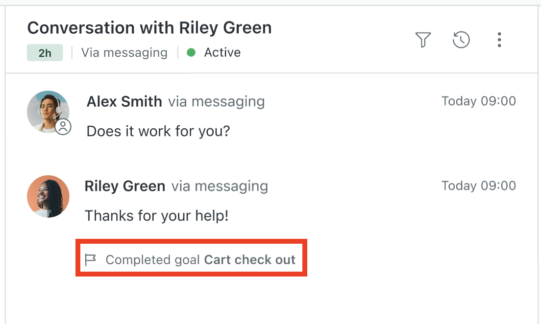 Quando um cliente conclui uma meta, o evento é exibido no histórico de conversas, no espaço de trabalho do agente.