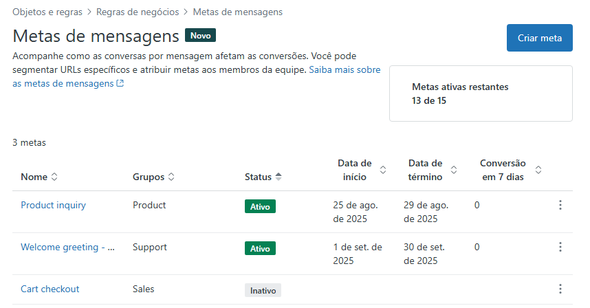 Na página Metas de mensagens, você pode criar uma meta para monitorar a atividade do usuário final.