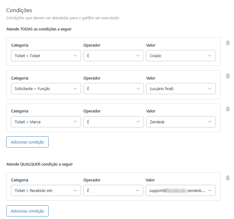 - Ticket > Recebido em | É | <seu endereço de e-mail do Support>