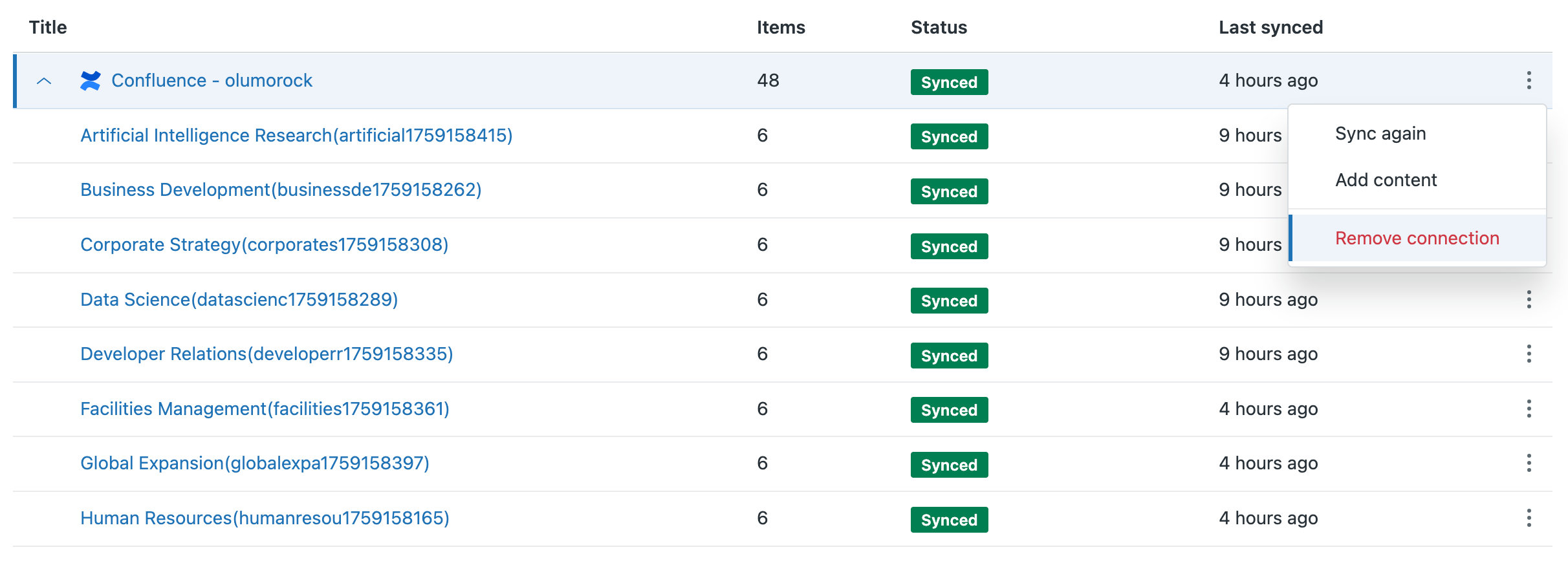 Ao adicionar espaços ao seu conector do Conhecimento para o Confluence, você pode visualizar informações sobre a conexão, quando ela foi criada e por quem, e quando foi sincronizada pela última vez.