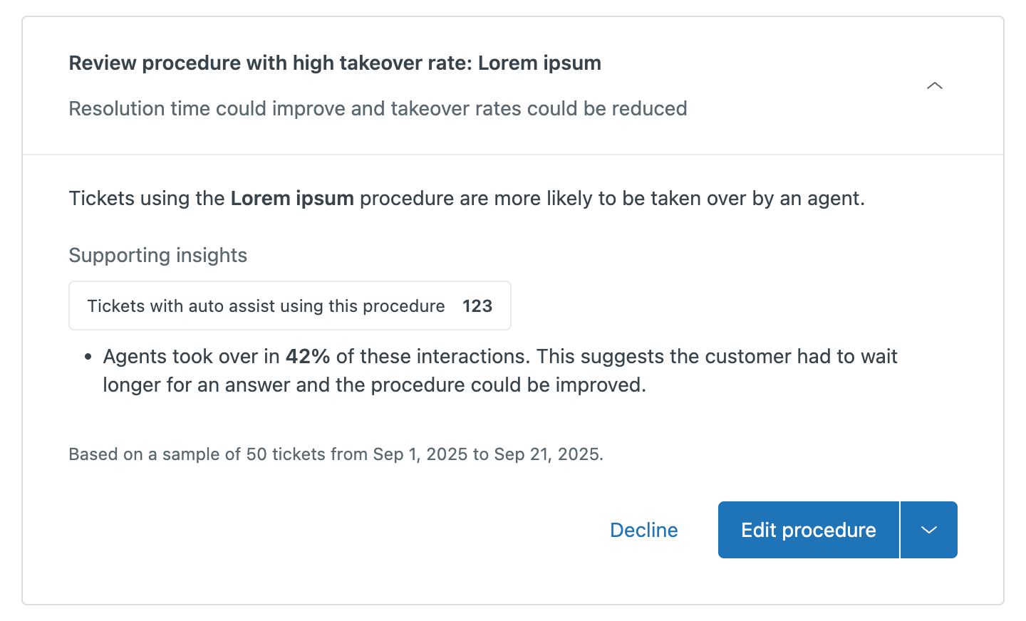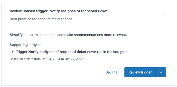 O Zendesk aprimorou a Visão geral: Página do Copiloto na Central de administração adicionando 15 novos tipos de recomendação sobre macros e automações, sugestões de intenção, gatilhos desatualizados e duplicados e muito mais. Além disso, agora você pode visualizar aceitos ou descartados por meio das recomendações.