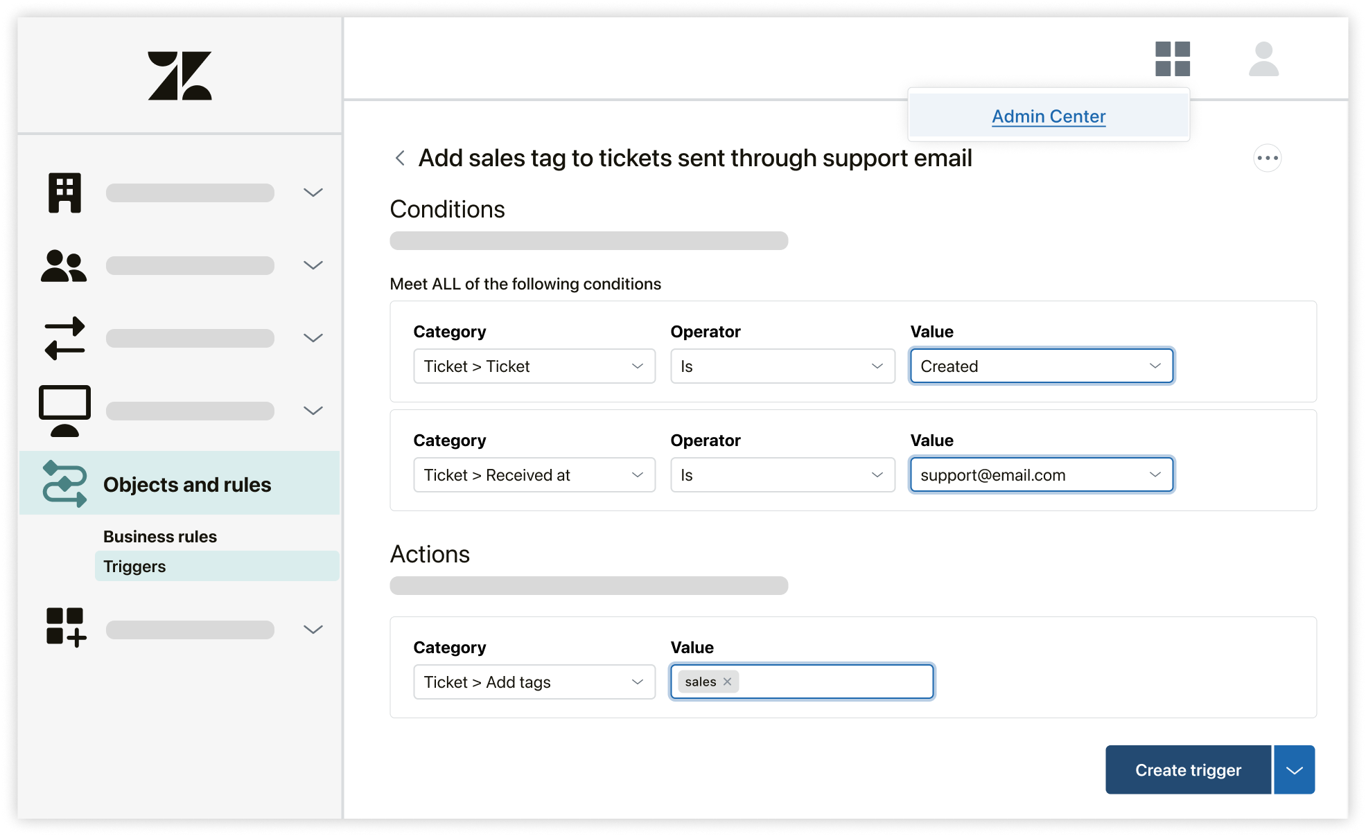 按照此触发器模板,根据客服电邮地址修改其他工单属性。例如,要为在一个客服电邮地址收到的所有工单添加标签,请修改操作以添加标签。根据您的工作流程混合和匹配触发器条件。