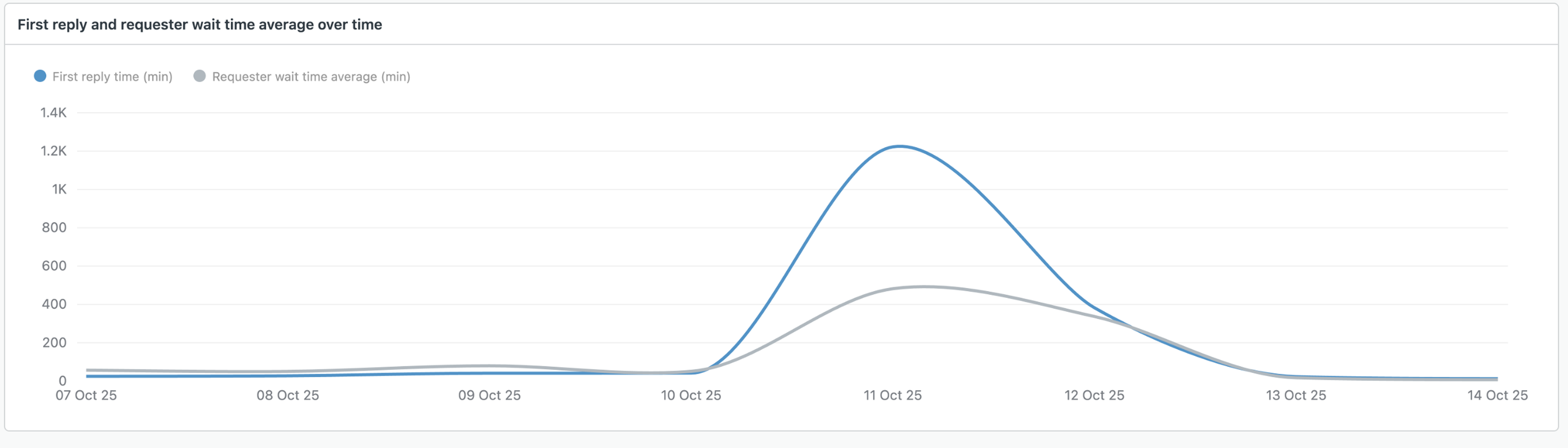 满意度与首次解决时间中值:首次解决时间、请求者等待时间(专员回复终端用户所用的时间)和各预定义类别的每天满意度评分,其中前两者在图表中显示为两条独立的线。