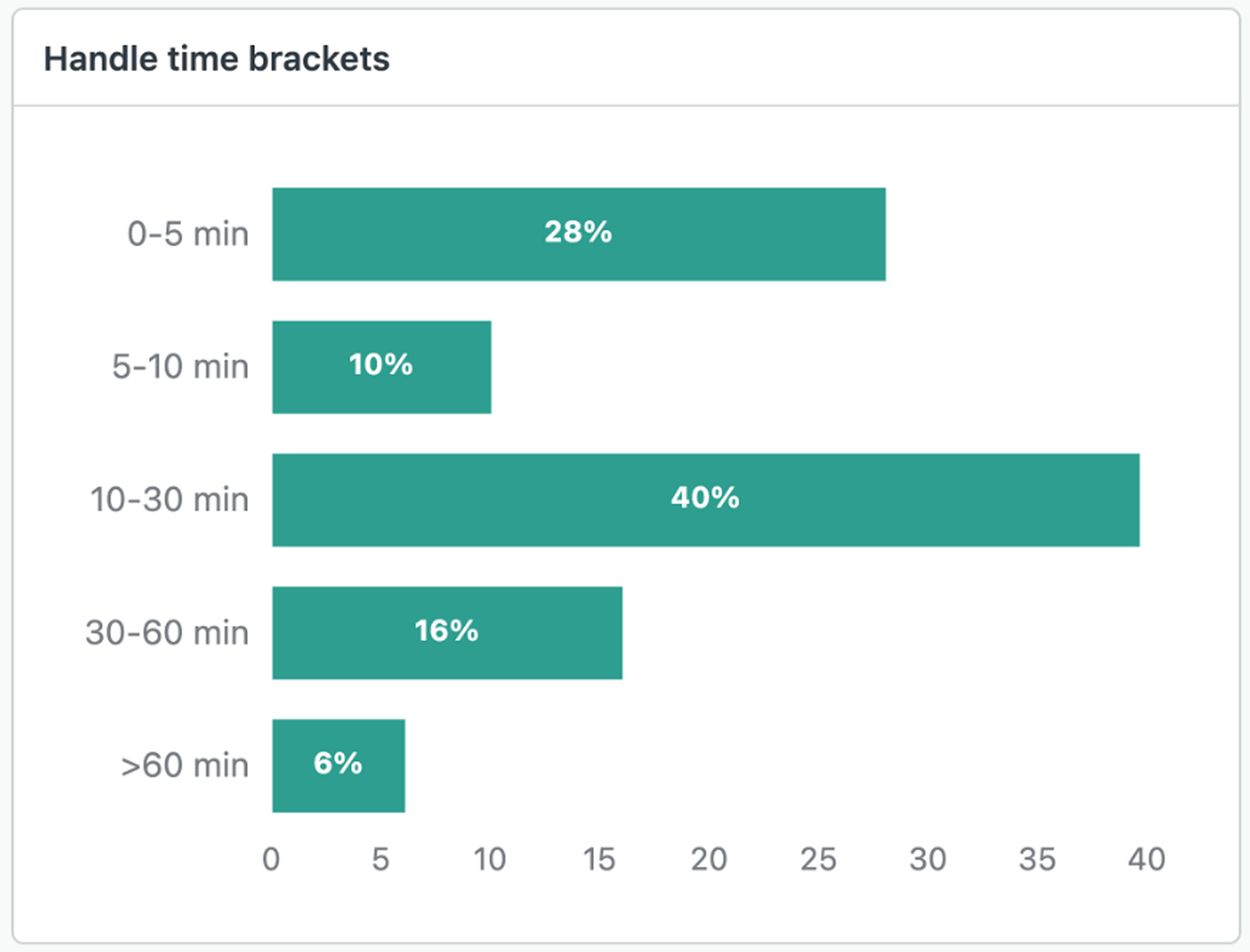 处理时间类别:与专员和终端用户互动所用的时间中值相关的消息传送工单在各预定义类别中所占的百分比。