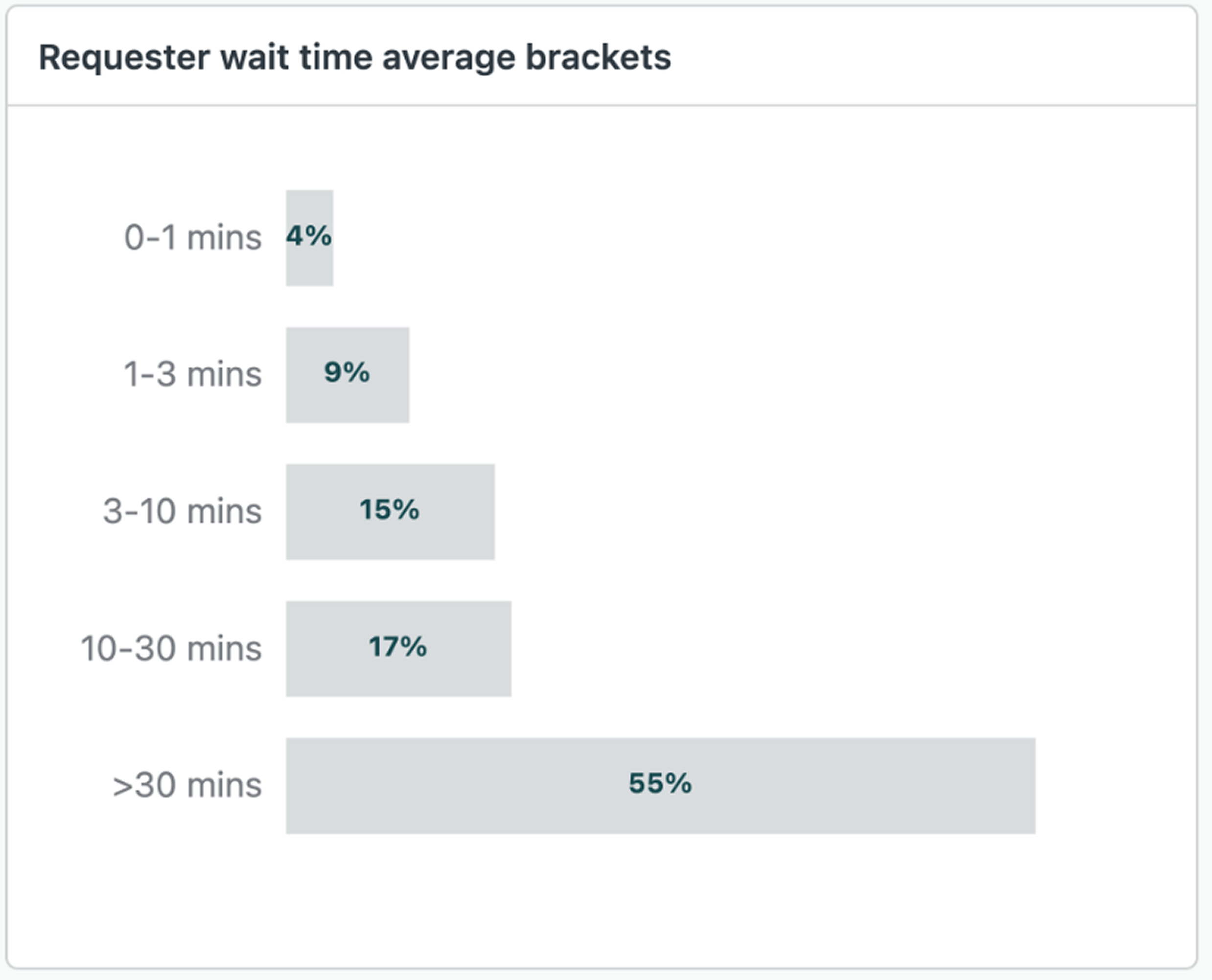 请求者平均等待时间类别:与专员回复的请求者平均等待时间相关的消息传送工单在各预定义类别中所占的百分比,显示为柱状图。