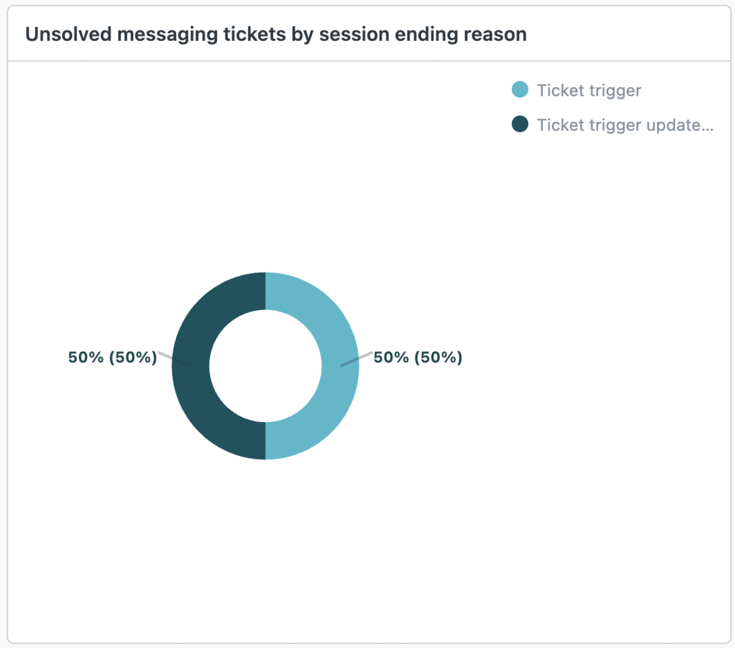按会话结束原因划分的未解决工单:按消息传送会话结束原因划分的处于“新建”、“已开启”、“待回应”和“暂停”状态的消息传送工单所占百分比:专员已结束会话,会话已由触发器结束,或会话因渠道更改而已结束。