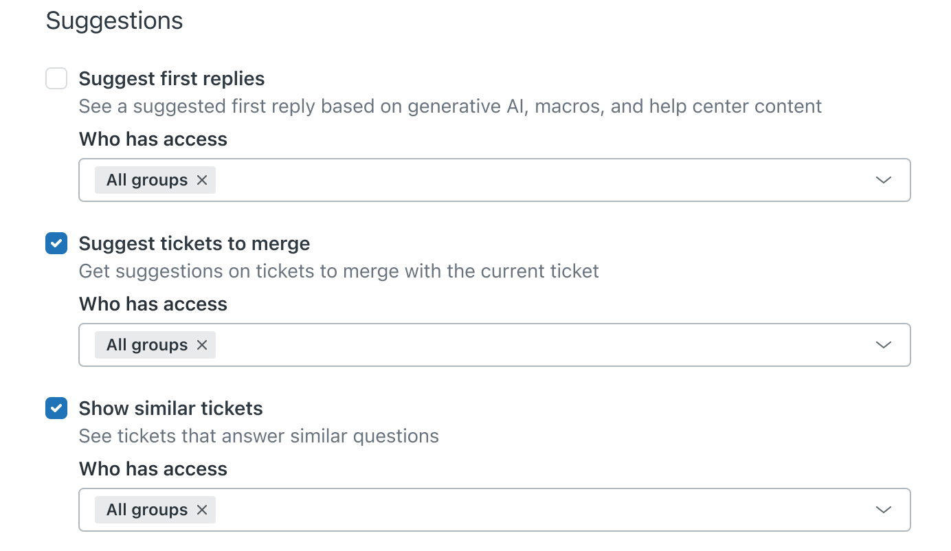 管理员可在管理中心打开或关闭类似工单,并选择有权访问的组。默认情况下,此功能是打开的。