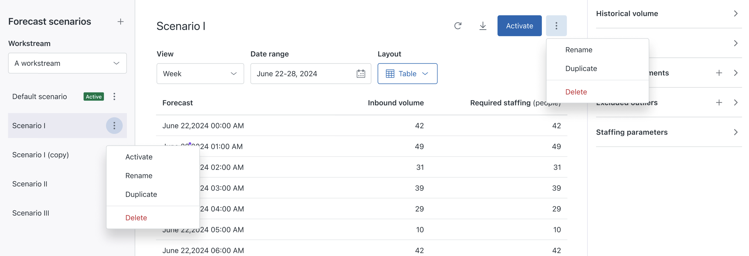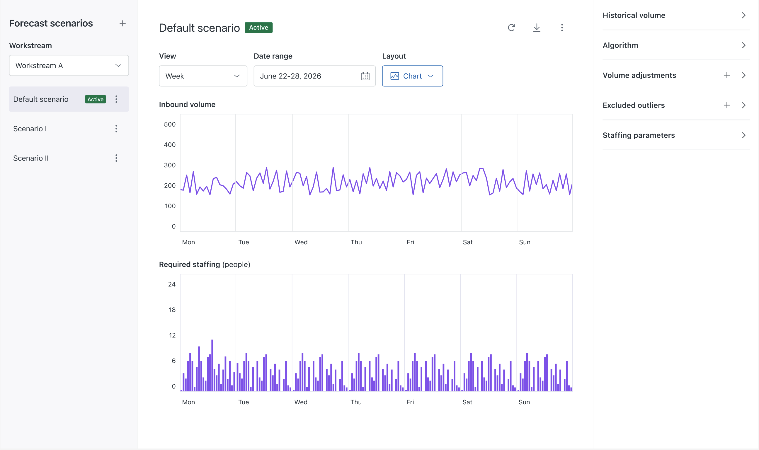 预测场景在早期试用中可用,您可以为不同的工作流创建和管理多个预测。调整对独特事件(如市场营销活动或节假日)的预测,以确保准确的规划。您可以测试各种算法和设置,激活方案,并管理历史数据,以优化人员配备和资源分配。管理员和授权团队成员可以创建、编辑和激活这些场景。