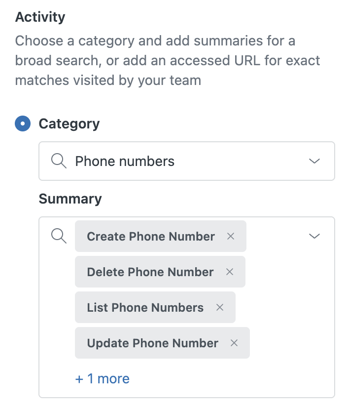 每个用例都包含类别和概要,用于筛选访问日志并查找相关访问事件。例如,在 监测联系号码更改以防止滥用或欺诈用例中,按 电话号码 类别和推荐的概要项目(例如 创建电话号码 和 删除电话号码)进行筛选以显示相关访问事件。